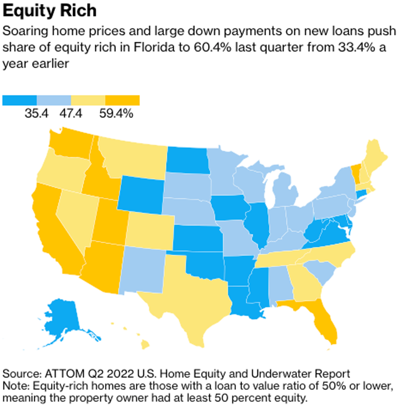 Elsewhere, In Bloomberg’s article published, 5 August 2022, “Almost Half of Mortgaged Homes in US Now Considered Equity-Rich .”This would be the 9th straight quarterly rise, according to the article, fuelled by strong house valuations during the pandemic area. The article definition of Equity-Rich as owners having over 50% in home equity. Some of the highest equity-rich states are Florida, California, Washington, Utah, Idaho (surprising), and Vermont.