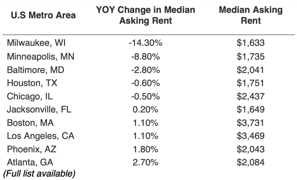 Top 10 LOWEST Year-on-year Change in Median Asking Rent (%) *
