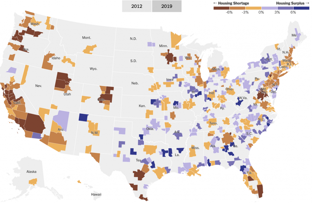 Here is a neat graphic from The New York Times, The Housing Shortage Isn't' Just a Coastal Thing Anymore" Badger and Washington, July 2022.
