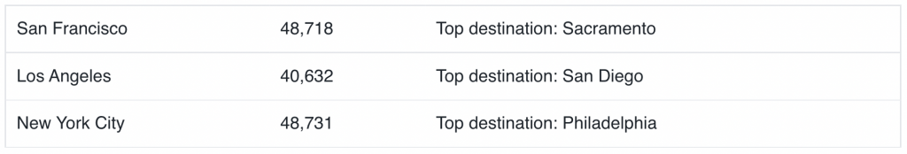 Sure, in some cities, there will be softening as residents gentrify out to lower cost of living areas. It’s no surprise that San Francisco, Los Angeles, and New York City are at the tops of those cities where there are significant outflows of residents.