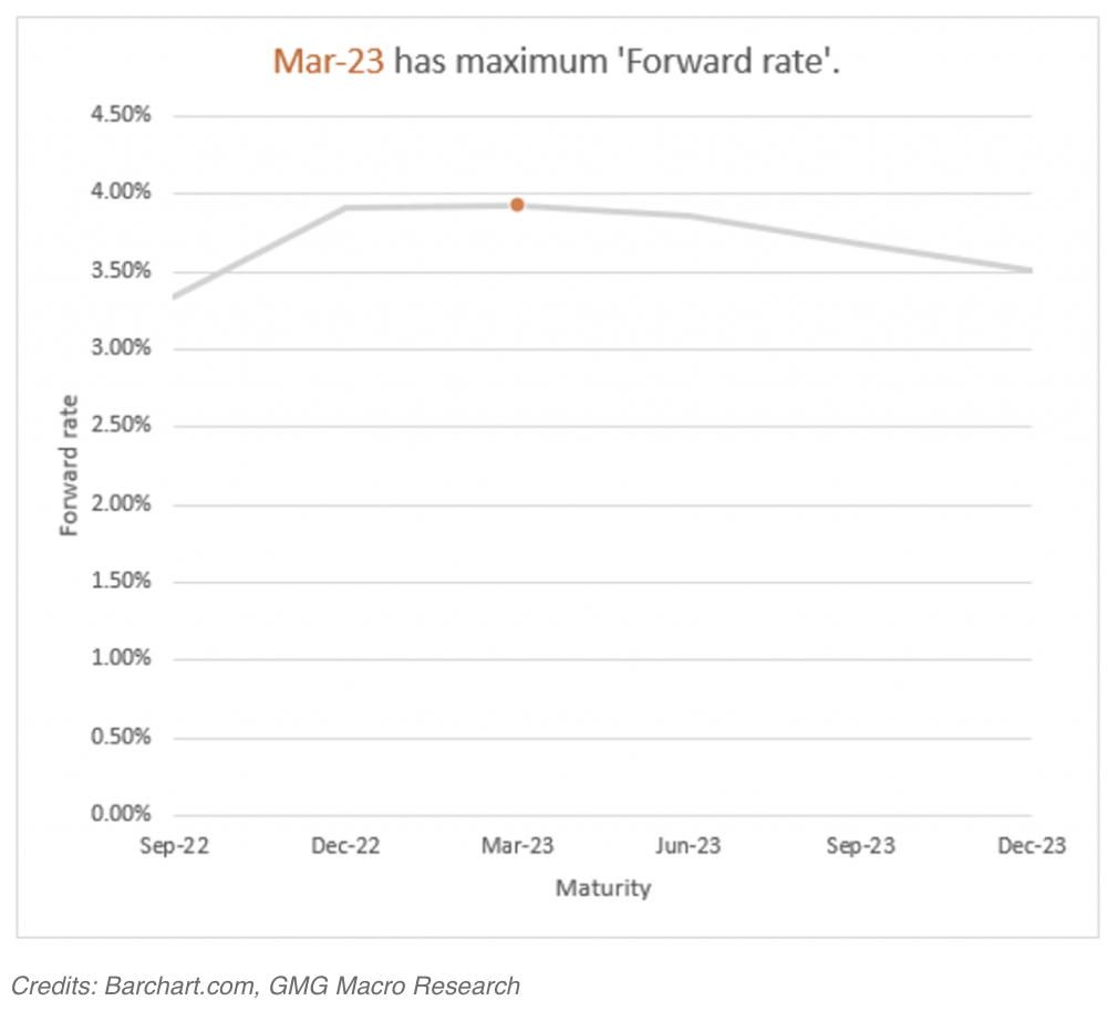 If you look at the Eurodollar implied futures curve, you will see that the market is expecting rates to peak in March 2023 at 3.93% and then start to decline to 3.51% by December 2023, and drop to 3.03% a year later. That is to say; the market is expecting 90 bps of decline in Fed Funds by December 2024! The charts also imply that rates are expected to stay under 3% thereafter.